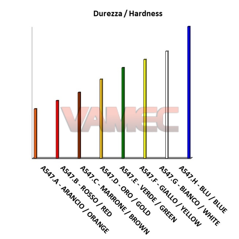 A - Orange - Extra Soft, B - Red - Soft C - Brown - Medium Soft D - Gold - Medium Flexible E - Green - Medium F - Yellow - Extra Flexible G - White - Medium Hard H - Blue - Hard