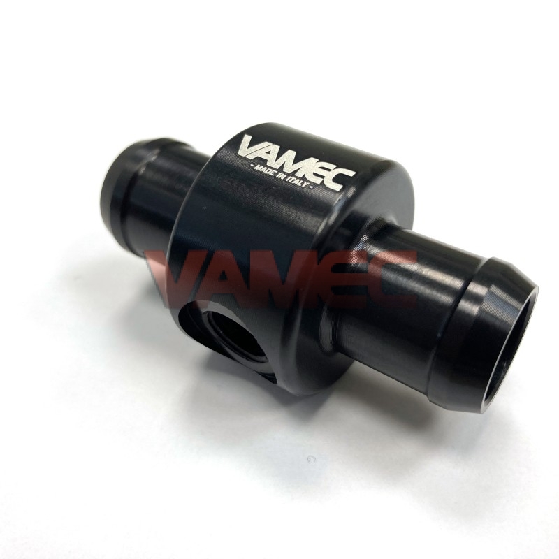 Fitting, in black anodized aluminum, for connecting the water temperature probe to the kart's cooling system.