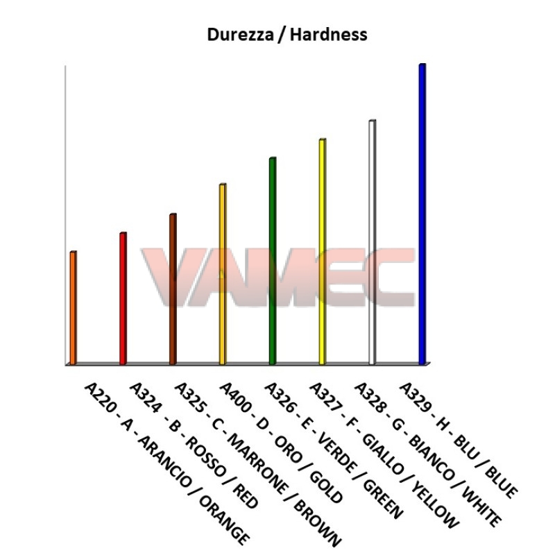 Disponibile in 8 diverse durezze, come da tabella allegata: