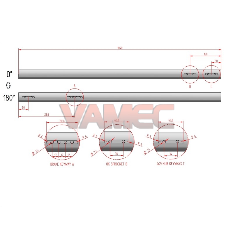 Assale per kart OK, 4 posizioni per chiavetta (mozzi ruota, mozzo disco freno e corona OK).